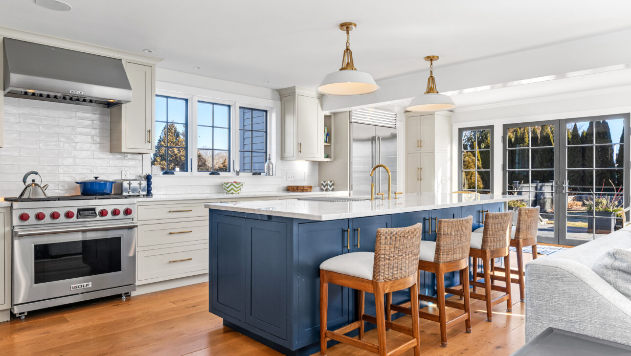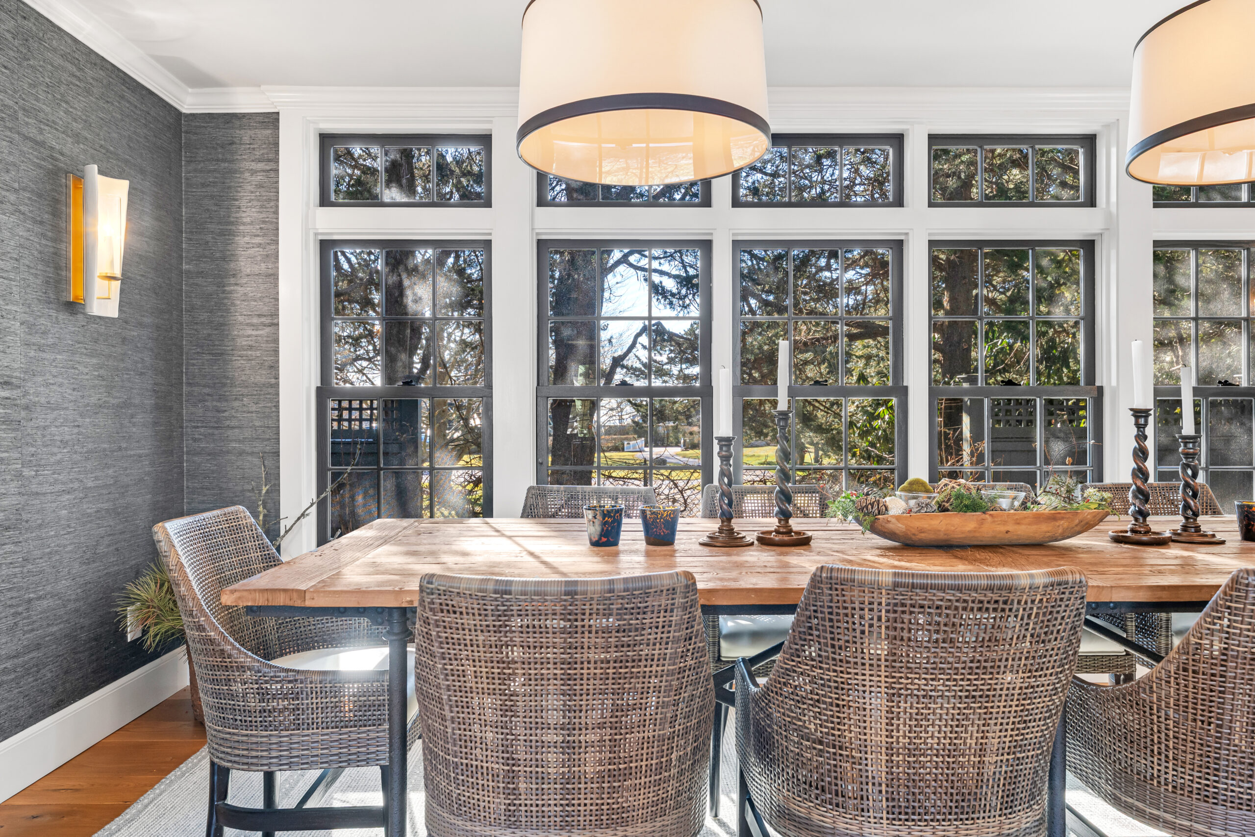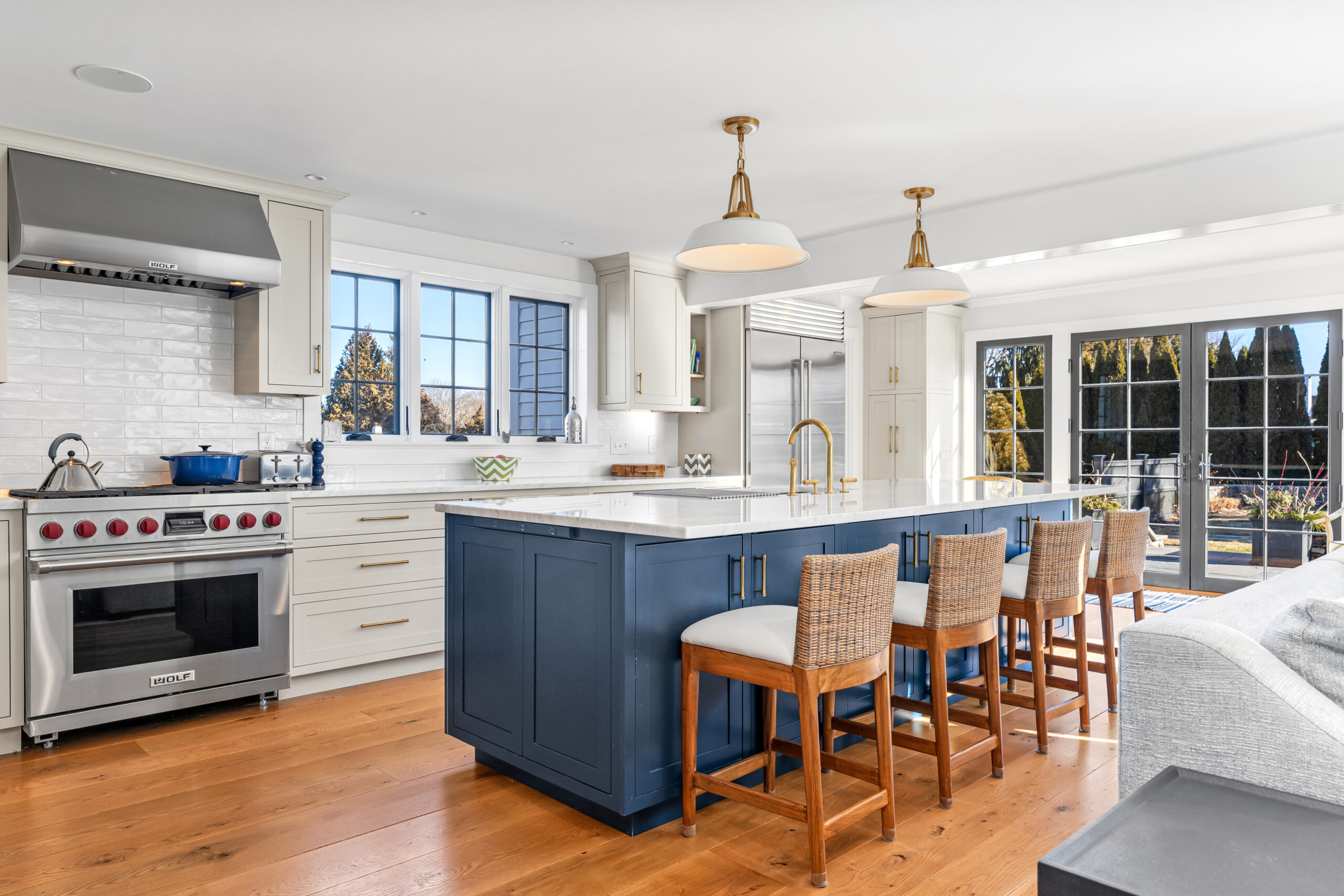 The first floor of the main house welcomes guests with a gracious entry adjacent to a cozy den featuring a wood-burning fireplace and sofa bed—ideal as an additional private sleeping space with the convenience of a nearby full bath. Beyond the stair hall, the home opens into an expansive open-plan kitchen and living area designed for effortless gathering. The kitchen is anchored by a striking 10-foot island and outfitted with Wolf and Sub-Zero appliances and dual dishwashers. An adjoining sitting area with sectional seating flows seamlessly into an elegant dining alcove, while a wet bar enhances the space for entertaining. Glass-paneled double doors lead directly to the outdoor patio, creating an easy indoor-outdoor connection.