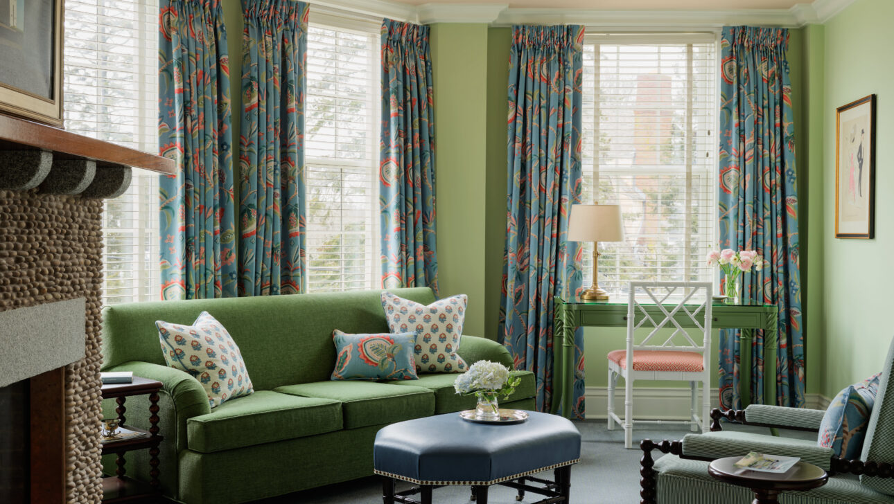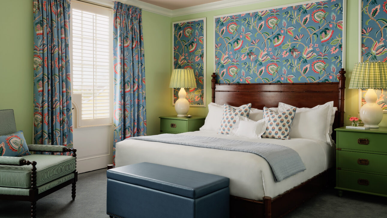 Three distinct design schemes guide the updated interiors, each featuring a lively interplay of patterns, textures, and hues. Floral motifs and chintz fabrics remain central to the aesthetic, now expressed with increased boldness and variation. Custom details—from tailored drapery to bespoke lampshades—bring cohesion and craftsmanship to each room, while wallpaper panels framed behind the beds introduce architectural interest and a sense of intimacy.